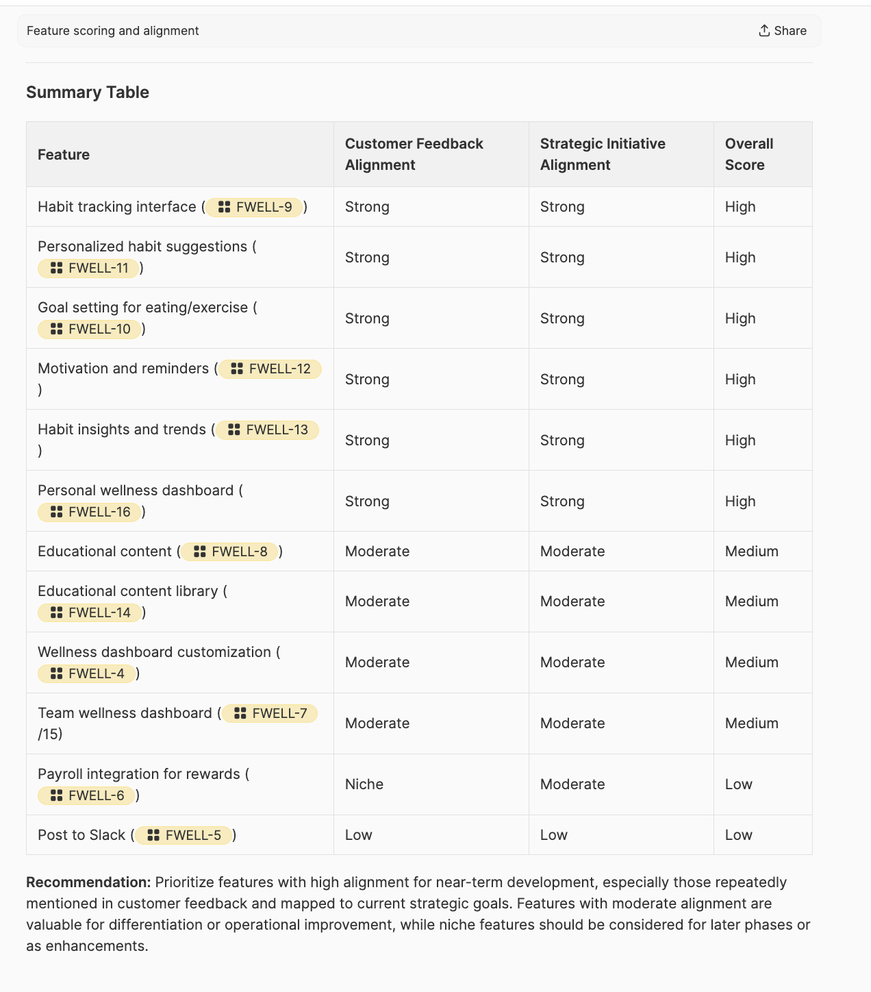 Objectively assess which features to build next. Run this AI request during planning sessions to help with prioritization. The AI assistant evaluates each feature against two critical dimensions — alignment with customer feedback and strategic initiatives — and assigns a score. It can also rank features based on score. The output is a table you can review with the team to decide what to focus on first. This reduces bias as you evaluate which features will have the biggest impact and provides a clear rationale behind your decisions.